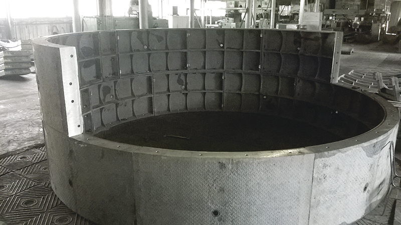 Производство чугунных тюбингов включает две стадии – получение отливки весом от 0,25 т до 1,5 т в зависимости от вида и типоразмера, а также проведение механической обработки, что включает фрезерование четырех сторон отливки, изготовление тампонажного и крепежных отверстий.